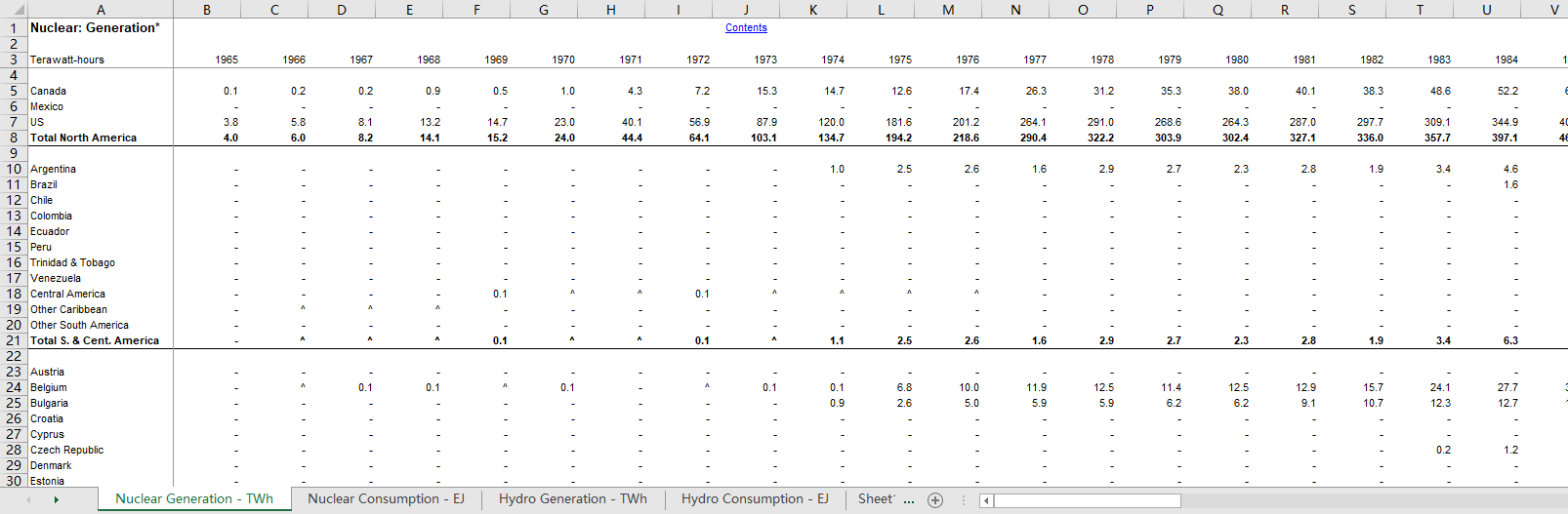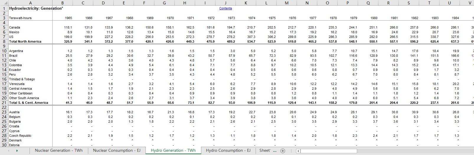全球世界各国1965-2022核能发电量消耗量水力发电量.xlsx