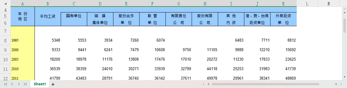 - 4-10 按登记注册类型城镇单位就业人员平均工资(全国,1995-2019).xlsx