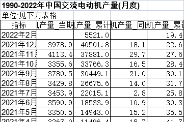 数据简介 该数据包含了1990-2022年中国交流电动机产量(月度)。2021年11月交流电动机产