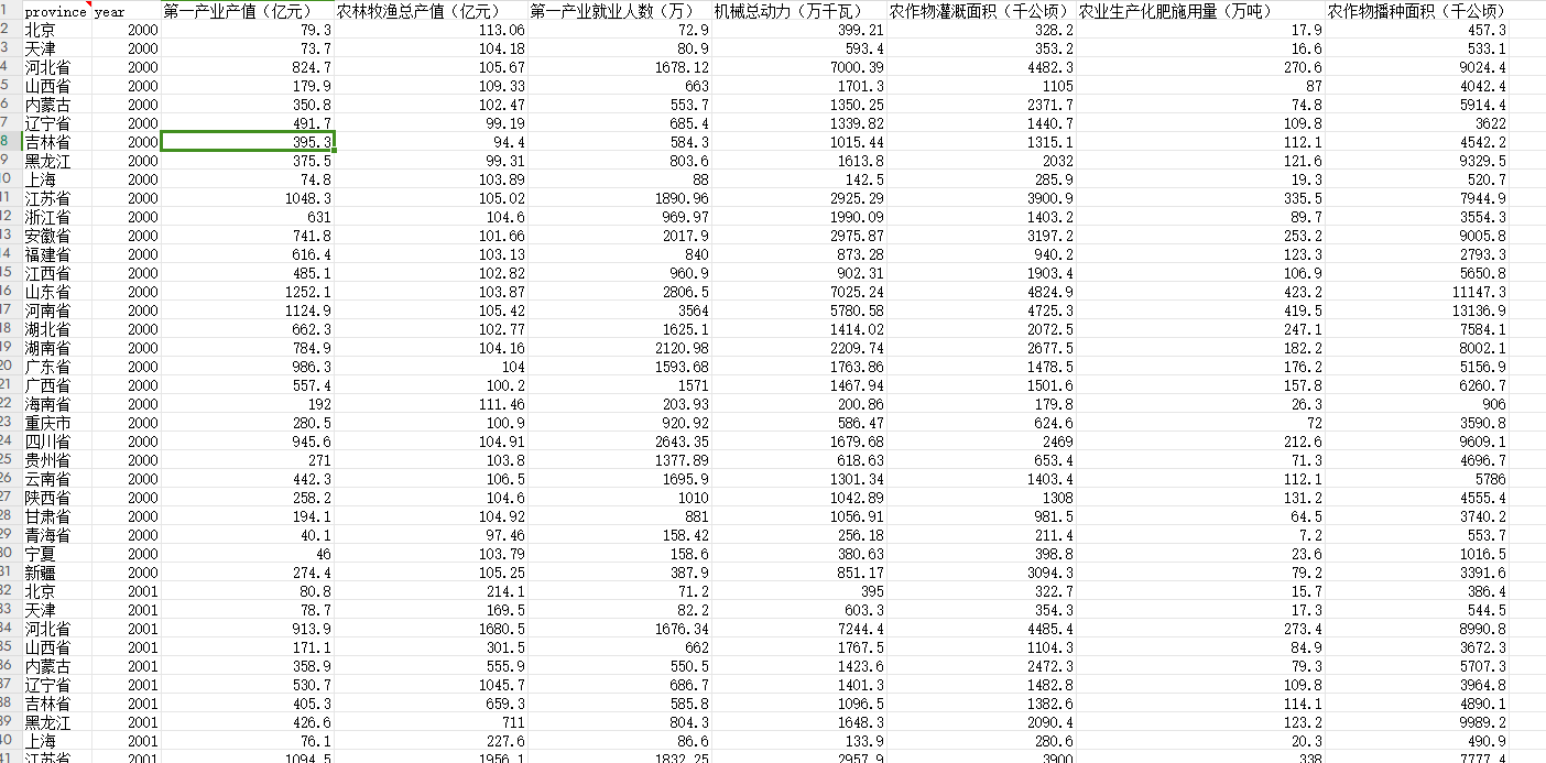 投入数据:第一产业就业人数、机械总动力、农作物灌溉面积、农业生产化肥施用量、农作物播种面积