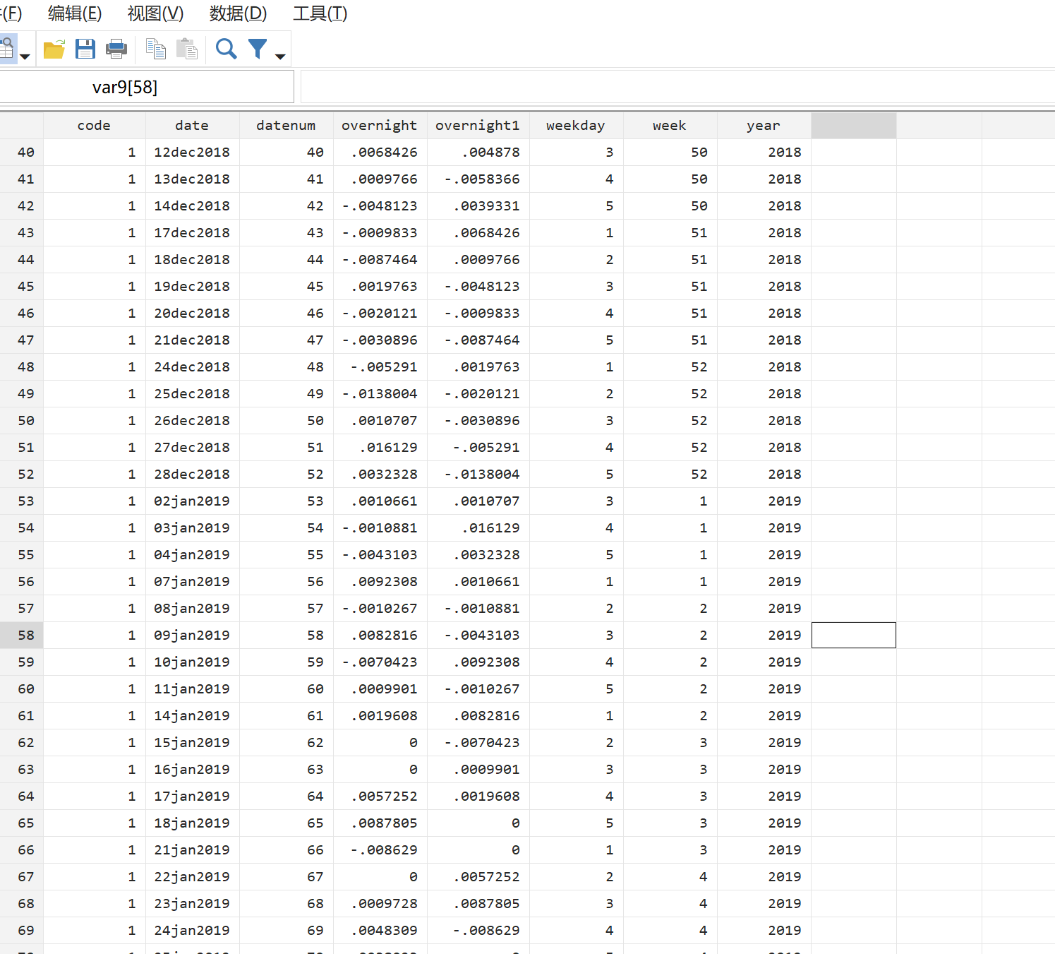tom22 发表于 2023-11-7 19:45 借鉴了你的思路,我将缺失的weekday的日期数据补上了(所有code均有周1至周5,缺失值为. ,这样滞后就没问 ...