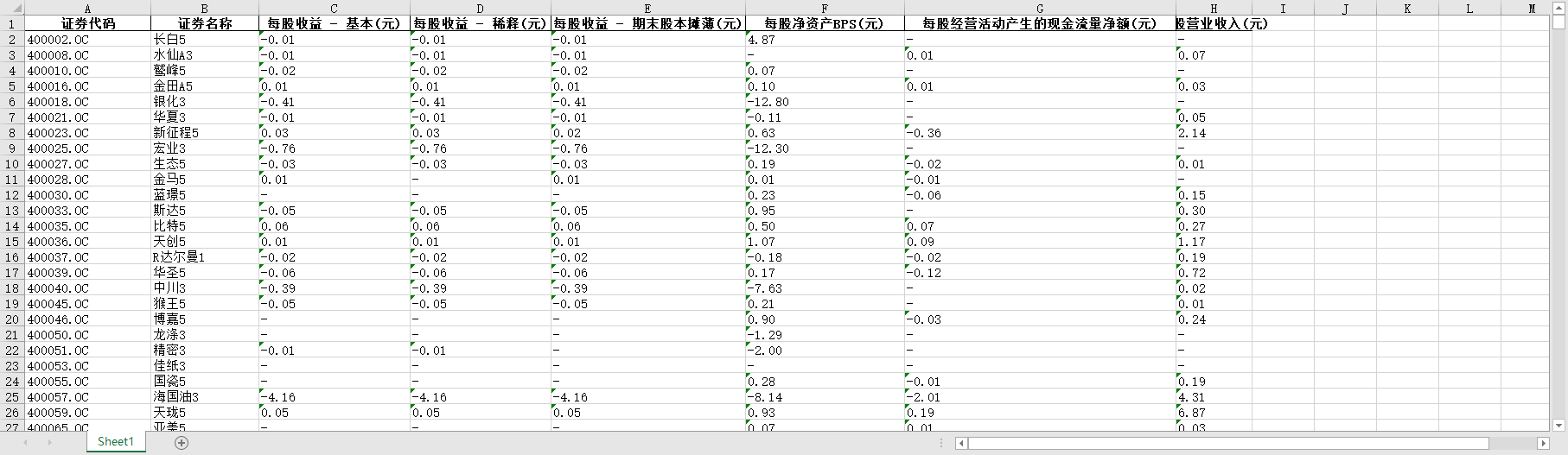证券代码 证券名称 每股收益 - 基本(元) 每股收益 - 稀释(元) 每股收益 - 期末股本摊薄(元) 每股净资产BPS(元) 每股经营活动产生的现金流量净额(元) 每股营业收入(元)