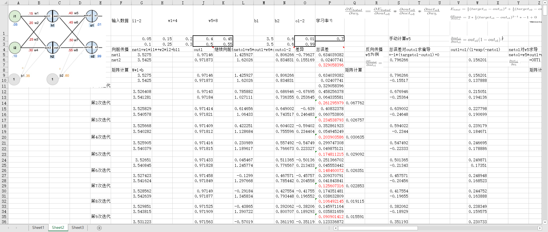 将BP神经网络计算过程以excel公式形式写出,关通过下拉行的形式进行迭代,主要是为理解网络的运行方式,参数变化情况