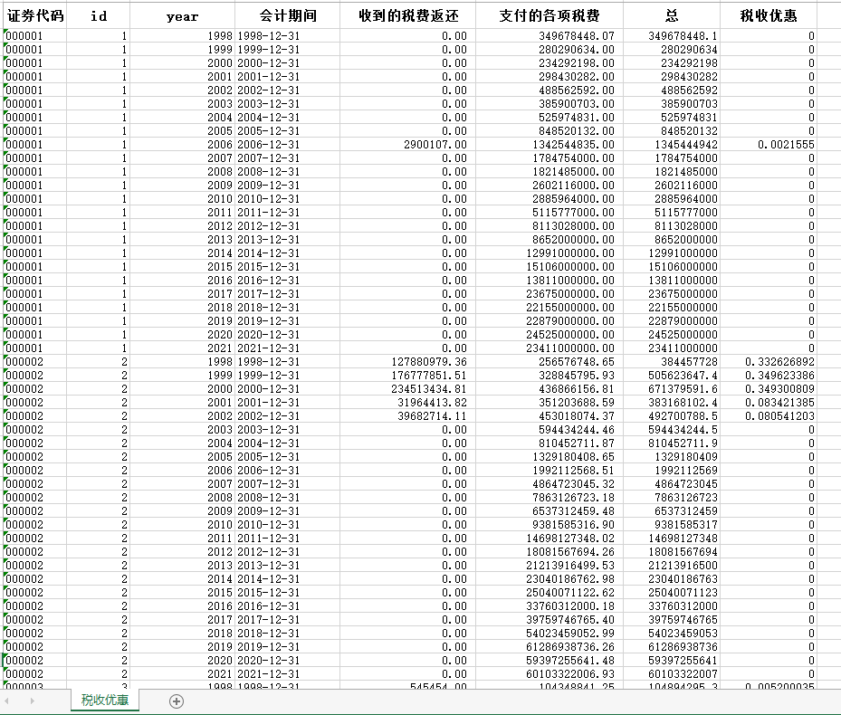1998-2021年上市公司企业税费税收返还、税费税收支出、税费税收优惠数据