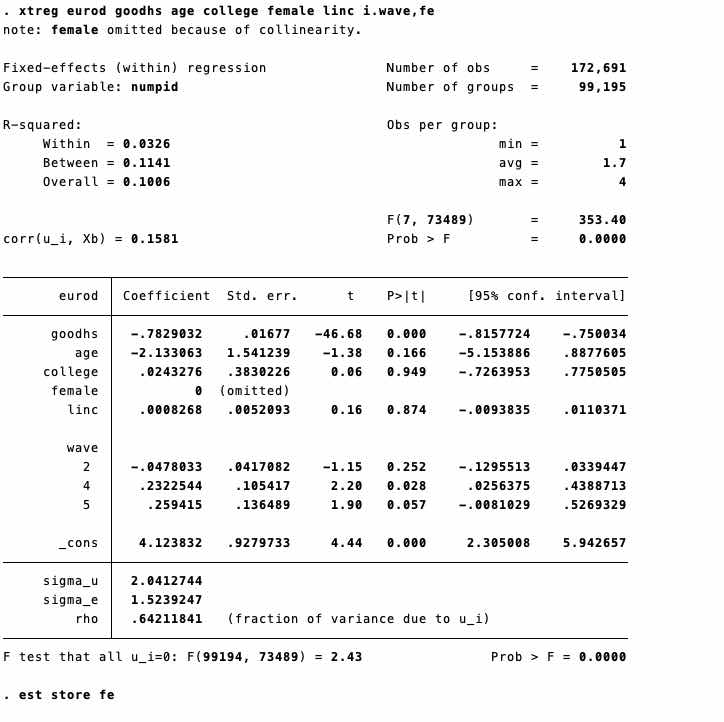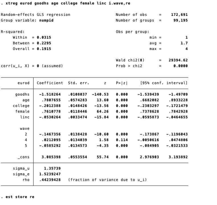 题目是讨论eurod和goodhs之间的因果推断,然后用stata做了RE、FE还有IVFE跑出来的结果要看什么值哇怎么分析哇