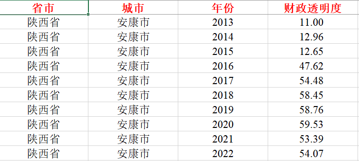 2013-2022年各城市财政透明度数据 ,样本时间新,数据量大,基本可以满足毕业论文写作和科研需求。数据真实可靠,辛苦整理所得,分享给大家,希望对论坛各位同学毕业论文以及论文发表有所帮助。分享这份数据一是为了贴补家用,二是为了共享知识,希望诚心需要的同学下载使用,使用过程中如有任何疑问,可以交流心得。衷心祝愿论坛各位同仁毕业和发文顺利!整理的非常完整,十分规范,排版也很漂亮,节省您大量收集与整理时间,绝对物有所值!