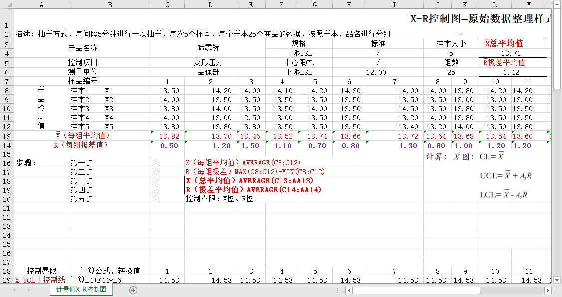 X-R控制图实现过程(8大判异),每列计算都含EXCEL公式,非常难得