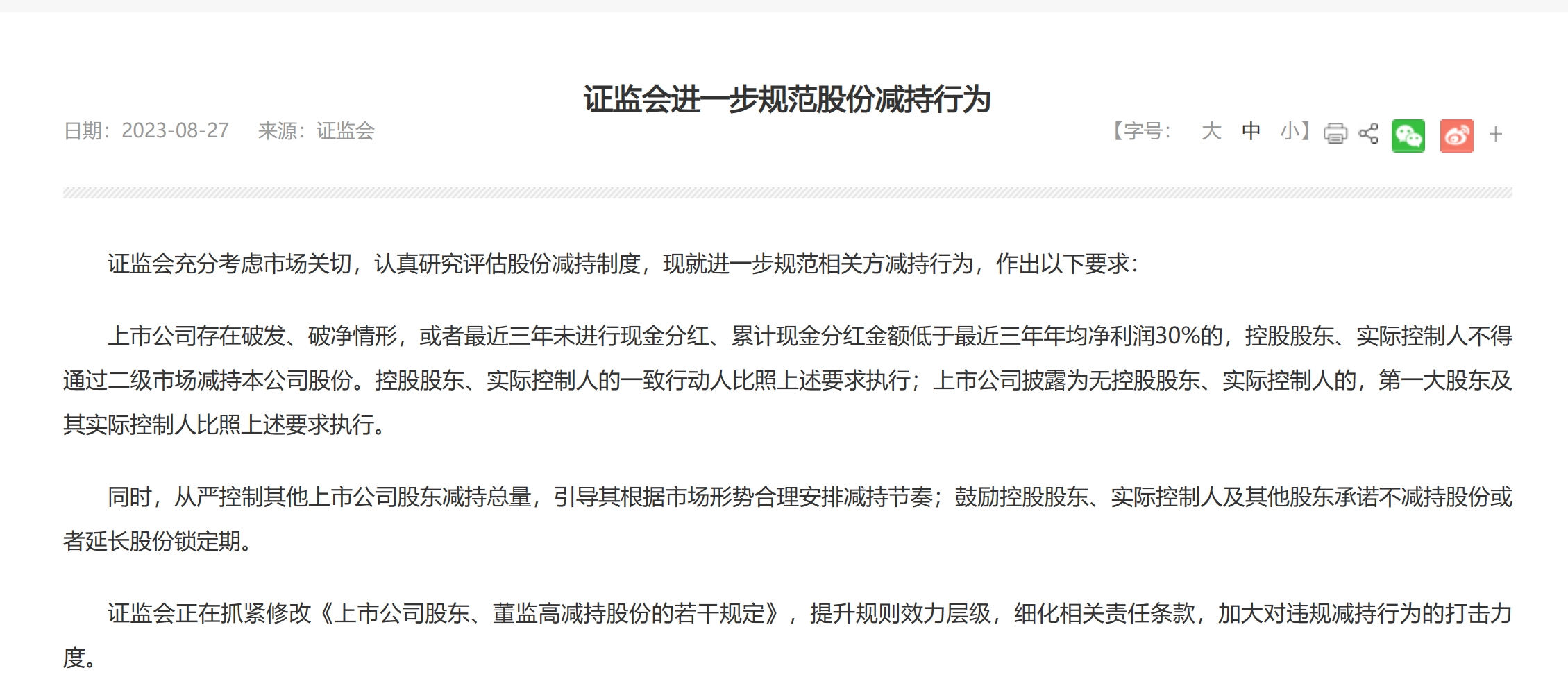 对于减持明确三条硬性要求