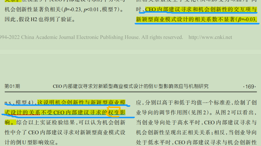 9姗姗~ 发表于 2024-1-5 19:32 这句话把X(CEO内部建议寻求)当成调节变量来看,把中介变量(机会创新性)当成自变量来看,意思是CEO内部 ...