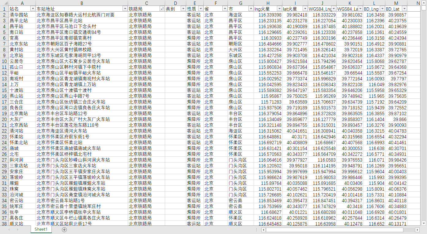提供全国所有 包含站点名称,站点地址,铁路局,省,市,经纬度清华园站 北京海淀区知春路大运村北航西门对面 北京铁路局 客运站 北京 海淀区