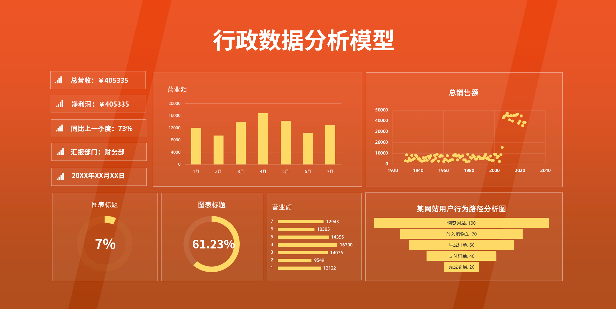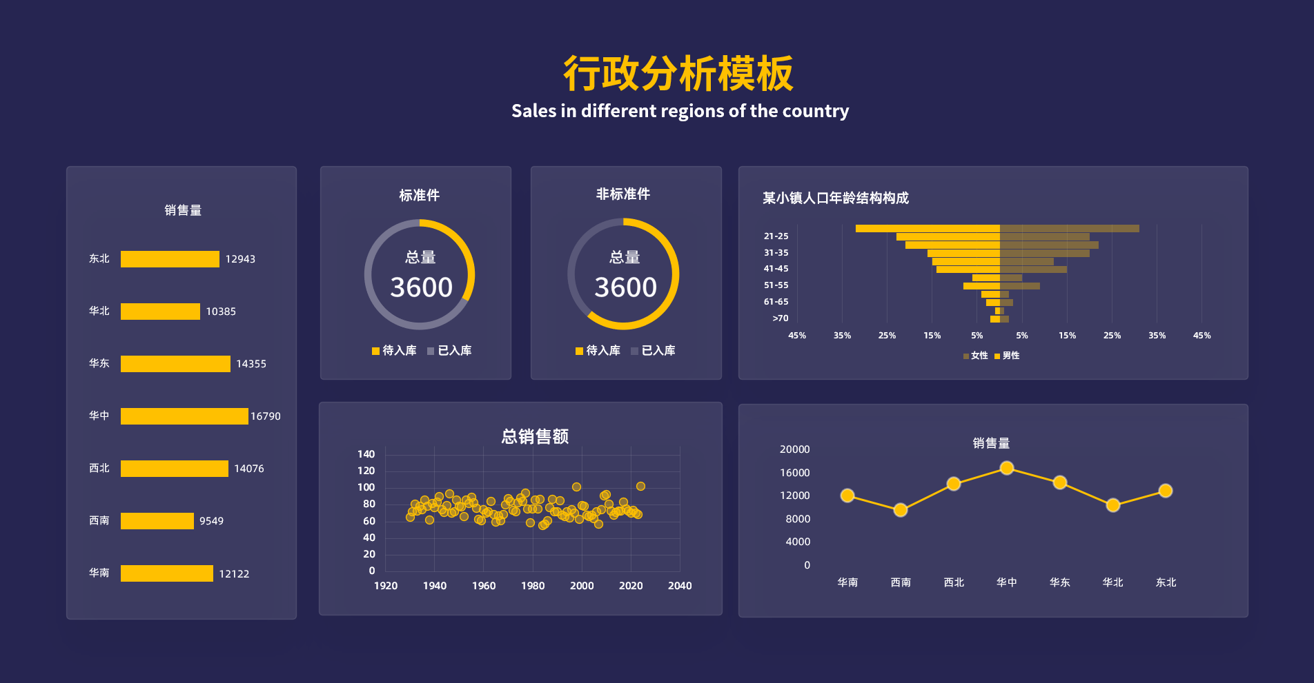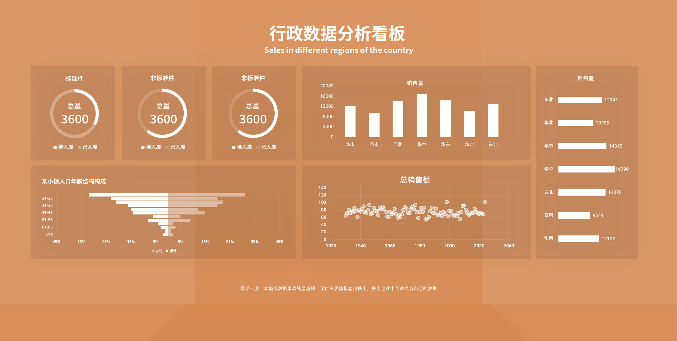 行政数据分析看板15套,Excel模板数据看板是数据可视化的载体。数据看板是一个可视化工具,通过合理的页面布局、效果设计,将可视化数据更直观、更形象的展现出来;数据看板是一个交流工具,通过数据公开和呈现,公司内部能够共享有效信息,激活组织间的交流与协作。数据看板通过简明扼要的数据可视化展现,直观反映出业务变化;通过数据驱动建议的方式快速清晰地发现问题、帮助业务成长。根据业务属性、业务需求,通过基础信息进行管理指标的计算和管控(如库存周转率)