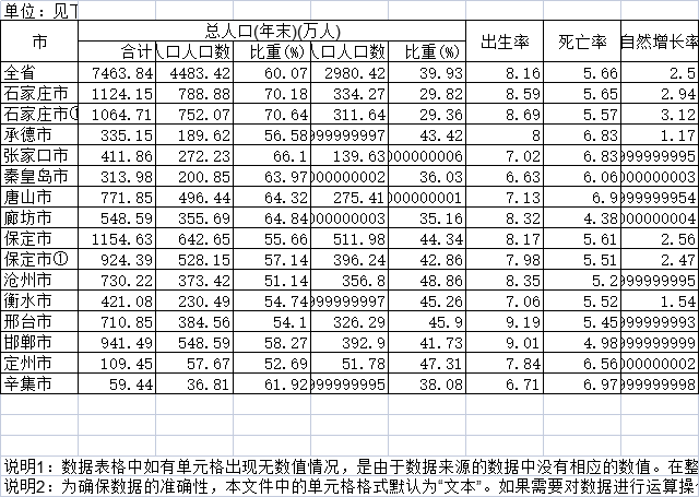 该数据包含了2020年河北省分市人口的城乡构成和出生率、死亡率、自然增长率。全省总人口为7463.84万人。