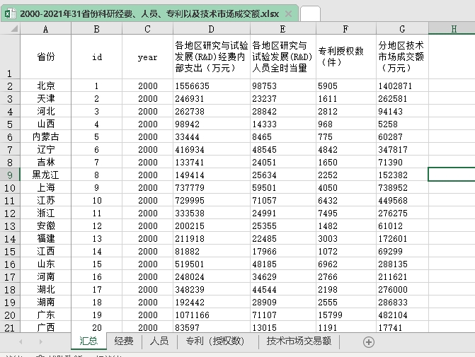 2000-2021年31省份科研经费、人员、专利以及技术市场成交额.xlsx