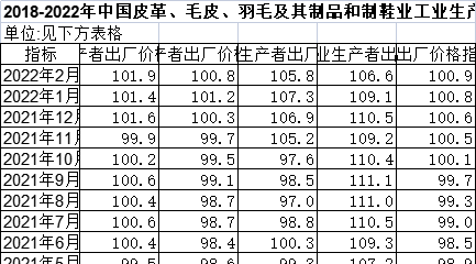 数据简介该数据包含了2018-2022年中国皮革、毛皮、羽毛及其制品和制鞋业工业生产者出厂价格指数(上年同月=100)(月度)。2022年2月皮革鞣制加工工业生产者出厂价格指数为101.9上年同月=100,皮革制品制造工业生产者出厂价格指数为100.8上年同月=100,毛皮鞣制及制品加工工业生产者出厂价格指数为105.8上年同月=100,制鞋业工业生产者出厂价格指数为100.9上年同月=100。