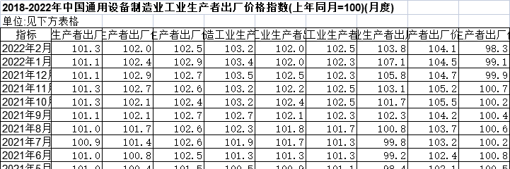 数据简介该数据包含了2018-2022年中国通用设备制造业工业生产者出厂价格指数(上年同月=100)(月度)。2018年5月锅炉及原动设备制造工业生产者出厂价格指数为102.5上年同月=100,金属加工机械制造工业生产者出厂价格指数为100.9上年同月=100,物料搬运设备制造工业生产者出厂价格指数为101.9上年同月=100,泵、阀门、压缩机及类似机械制造工业生产者出厂价格指数为102.2上年同月=100,轴承、齿轮和传动部件制造工业生产者出厂价格指数为102.2上年同月=100。