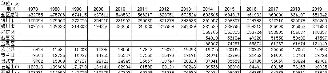 截至2020年宁夏自治区主要年份各市县在岗职工人数.xlsx