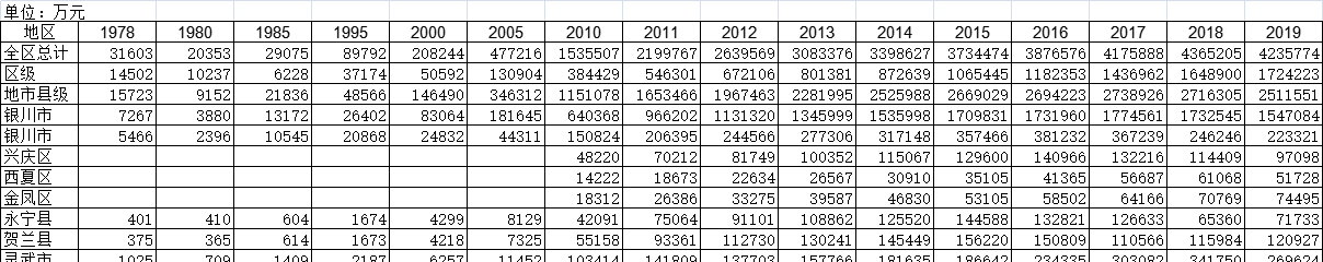 该数据包含了截至2020年宁夏自治区各地市县地方一般公共预算收入。全区总计197831603万元。