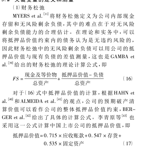 2.测算方式:参考C刊《管理科学》刘宇尧(2018)老师的研究,将抵押品价值约束内的债务认为是无违约风险的,因此财务松弛中的无风险剩余负债可以用公司的抵押品价值与现有负债的差值测量。具体公式如下图所示