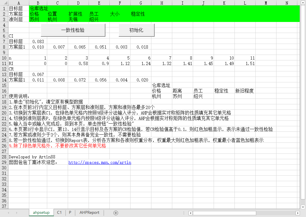 使用说明:1.单击"初始化",清空原有模型数据2.在本页前3行内定义目标层、方案层和准则层,方案和准则各最多20个3.切换到方案层表C1,在绿色单元格内按照9级评分法输入评分,AHP会根据实对称矩阵的性质填充其它单元格4.切换到准则层表P,在绿色单元格内按照9级评分法输入评分,AHP会根据实对称矩阵的性质填充其它单元格5.输入当中或输入完成后,回到本页,单击按钮"一致性检验"6.本页第8行中显示CI,第13、14行显示目标及各方案的CR检验值,若CR检验值高于0.1,则红色加粗显示,表示未通过一致性检验7.若方案或准则少于3个,则其本身具备完全一致性,不需要检验8.若一致性检验通过,切换到Report表,分析各方案和各准则权重分布,权重最大则红色加粗表示,权重最小者蓝色加粗表示9.除了绿色单元格外,不要修改其它任何单元格