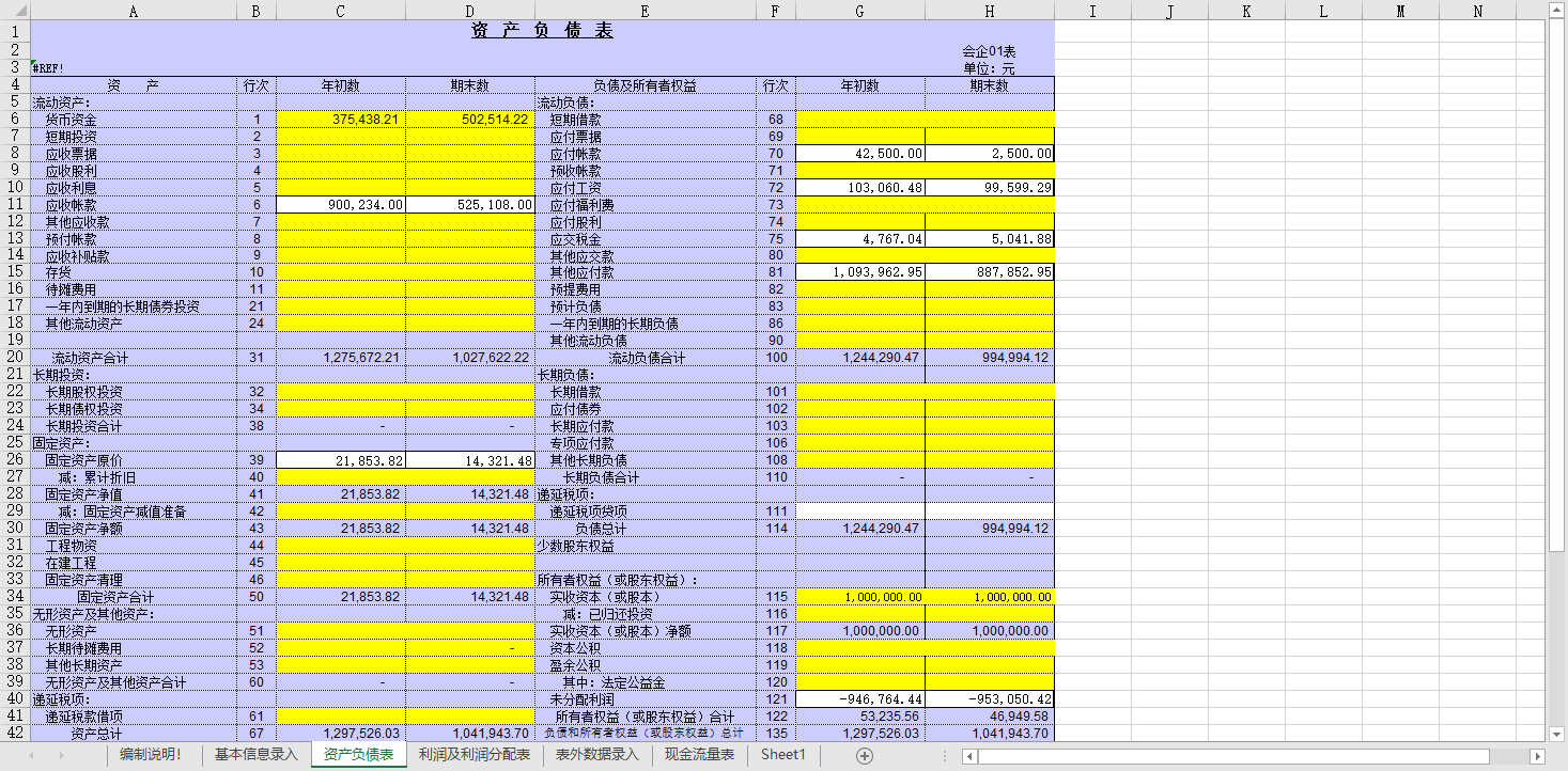 如有两大主表的电子文档,则可以直接将两大主表数据直接复制,此项操作前提是电子文档报表格式须与本工作表报表格式一致,本工作表各报表格式是根据《企业会计制度》规定格式编制,若电子文档报表是按制度规定的统一格式编制的,则直接复制覆盖即可。