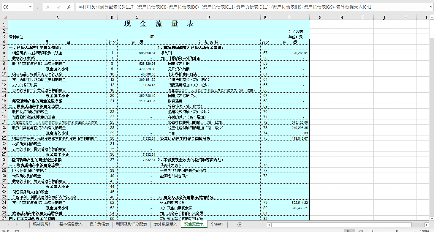 在资产负债表、利润及利润分配表及表外数据输入完毕之后,你可以发现,现金流量表已全部自动完成并自动平衡。
