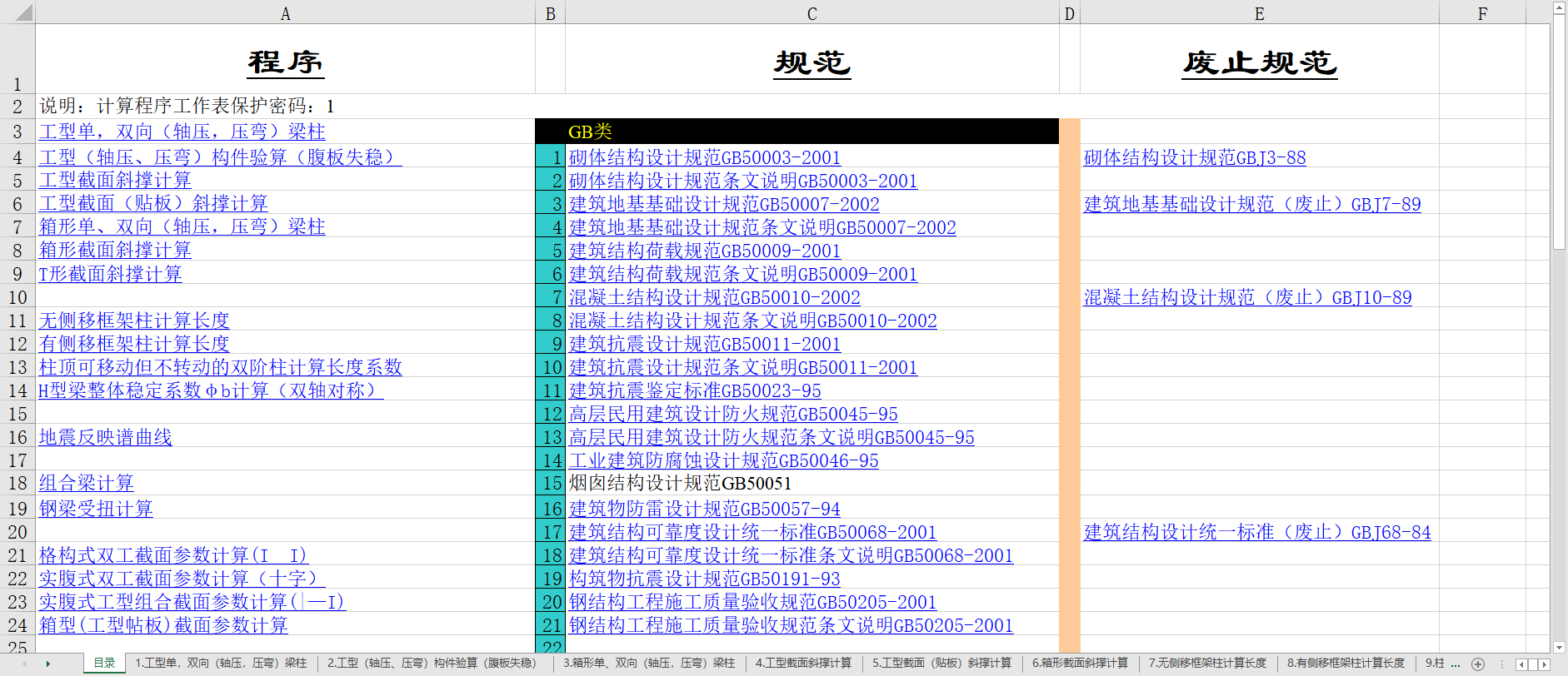 一个强大的结构计算excel软件,共有25项砌体结构设计规范GB50003-2001砌体结构设计规范条文说明GB50003-2001建筑地基基础设计规范GB50007-2002建筑地基基础设计规范条文说明GB50007-2002建筑结构荷载规范GB50009-2001建筑结构荷载规范条文说明GB50009-2001混凝土结构设计规范GB50010-2002混凝土结构设计规范条文说明GB50010-2002建筑抗震设计规范GB50011-2001建筑抗震设计规范条文说明GB50011-2001建筑抗震鉴定标准GB50023-95高层民用建筑设计防火规范GB50045-95高层民用建筑设计防火规范条文说明GB50045-95工业建筑防腐蚀设计规范GB50046-95烟囱结构设计规范GB50051建筑物防雷设计规范GB50057-94建筑结构可靠度设计统一标准GB50068-2001建筑结构可靠度设计统一标准条文说明GB50068-2001构筑物抗震设计规范GB50191-93钢结构工程施工质量验收规范GB50205-2001钢结构工程施工质量验收规范条文说明GB50205-2001GBJ类木结构设计规范GBJ5-88钢结构设计规范GBJ17-88冷弯薄壁型钢结构技术规范GBJ18-87给水排水工程结构设计规范GBJ69-84钢筋混凝土升板结构技术规范GBJ130-90高耸结构设计规范GBJ135-90JGJ类钢筋混凝土高层建筑结构设计与施工规程JGJ3-91工业与民用建筑灌注桩基础设计与施工规程JGJ4-80高层建筑箱形与筏形基础技术规范JGJ6-99网架结构设计与施工规程JGJ7-91钢筋轻骨料混凝土结构设计规程JGJ12-82冷拔钢丝预应力混凝土构件设计与施工规程JGJ19-92建筑地基处理技术规范JGJ79-91建筑钢结构焊接规程JGJ81-91钢结构高强度螺栓连接的设计、施工及验收规程JGJ82-91建筑桩基技术规范JGJ94-94冷轧带肋钢筋混凝土结构技术规程JGJ95-95高层民用建筑钢结构技术规程JGJ99-98建筑抗震加固技术规程JGJ116-98冻土地区建筑地基基础设计规范JGJ118-98金属与石材幕墙工程技术规范JGJ133-2001金属与石材幕墙工程技术规范条文说明JGJ133-2001型钢混凝土组合结构技术规程JGJ138-2001型钢混凝土组合结构技术规程条文说明JGJ138-2001CECS类钢结构防火涂料应用技术规范CECS24-90混凝土结构加固技术规范CECS25-90钢管混凝土结构设计与施工规程CECS28-90钢筋混凝土承台设计规程CECS88-97钢结构加固技术规范CECS77-96门式刚架轻型房屋钢结构技术规程CECS102-98点支式玻璃幕墙工程技术规程CECS127-2001点支式玻璃幕墙工程技术规程条文说明CECS127-2001