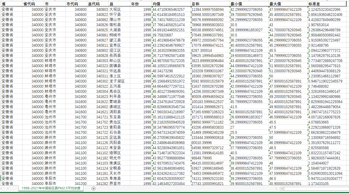 1998-2021年中国2878区县PM2.5面板数据均值总和最小值最大值标准差