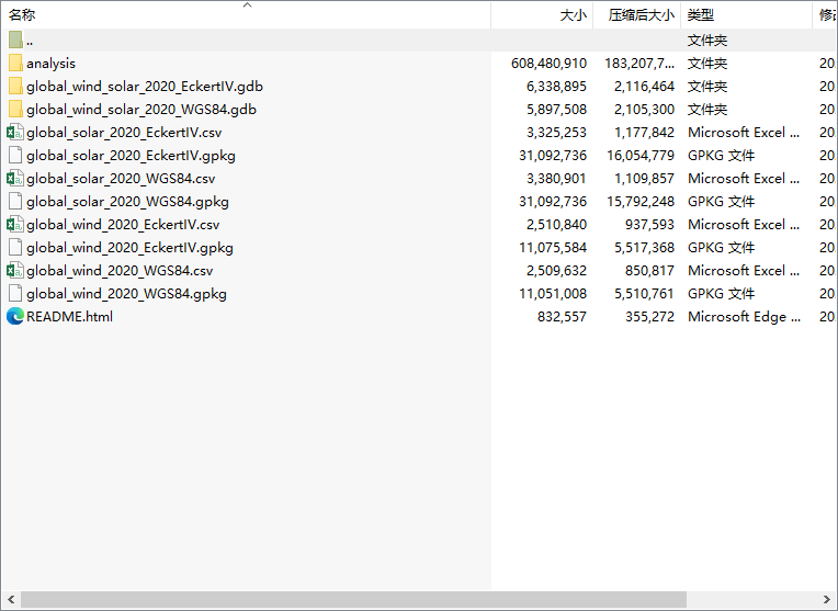 数据集表示以下数据的三种不同格式:全球风力涡轮机集群使用800米的邻居距离;全球太阳能装置使用400米的邻居距离聚集在一起。格式包括:ESRI地理数据库(*.gdb):用于ArcGIS的专有地理空间文件格式,在同一文件中包含两层,一层用于太阳能,另一层用于风能;Geopackages(*.gpkg):开源的地理空间文件格式,可以与各种软件配合使用,并可以本地存储不同的几何图形;逗号分隔文件(*.csv):最简单的格式,这些文件表示每个数据记录的质心,即点数据,作为数据表中的X和Y坐标。还包括一个归档文件夹analysis,其中包含四个R脚本和用于获取和处理数据的附带数据。