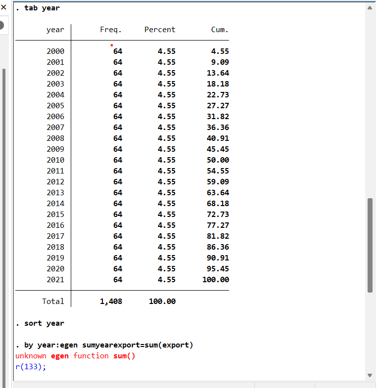 目的:将每年的出口数据求和,求和后一年中64个国家的sumyearexport数据要一样,然后每年保留一个国家的sumyearexport数据,然后算逐年的增长率