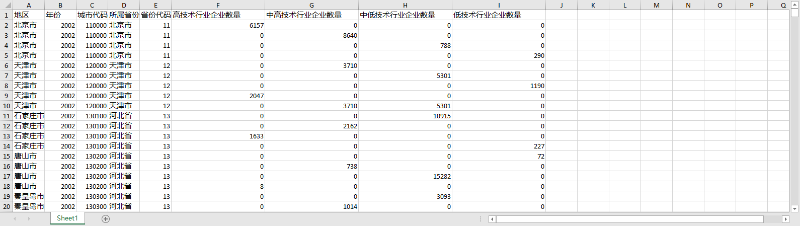 2、指标:地区、年份、城市代码、所属省份、省份代码、高技术行业企业数量、中高技术行业企业数量、中低技术行业企业数量、低技术行业企业数量