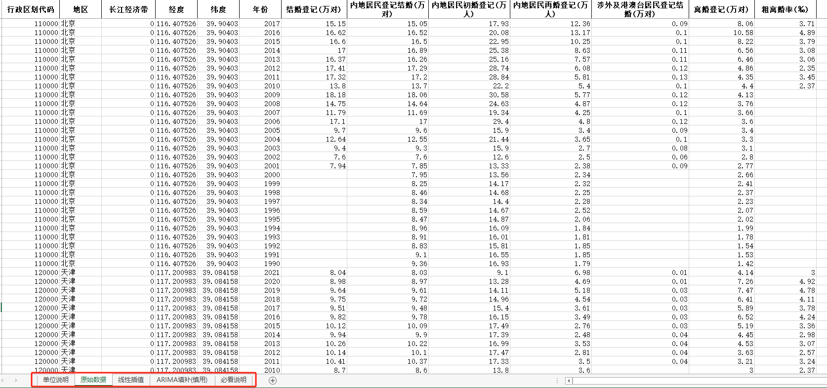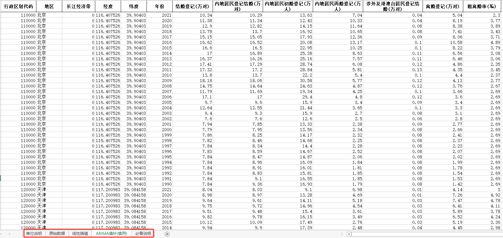 1990-2021年全国31省自治州直辖市-结婚初婚再婚离婚登记离婚率数据ARIMA填补无缺失