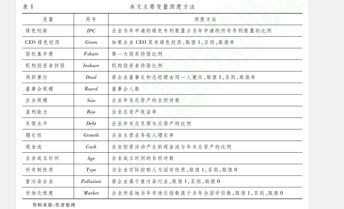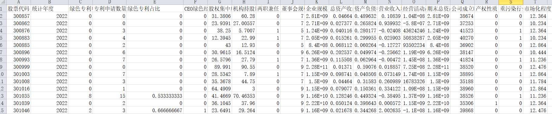 3.数据指标:4254家企业,3.3万个样本,具体指标为股票代码 统计年度 绿色专利申请数量 专利申请数量 绿色专利占比 CEO绿色经历 股权集中度 机构持股比例 两职兼任 董事会规模 企业规模 总资产收益率 资产负债率 营业收入增长率 经营活动产生的现金流 期末总资产 公司成立时间 产权性质 重污染行业 市场化程度