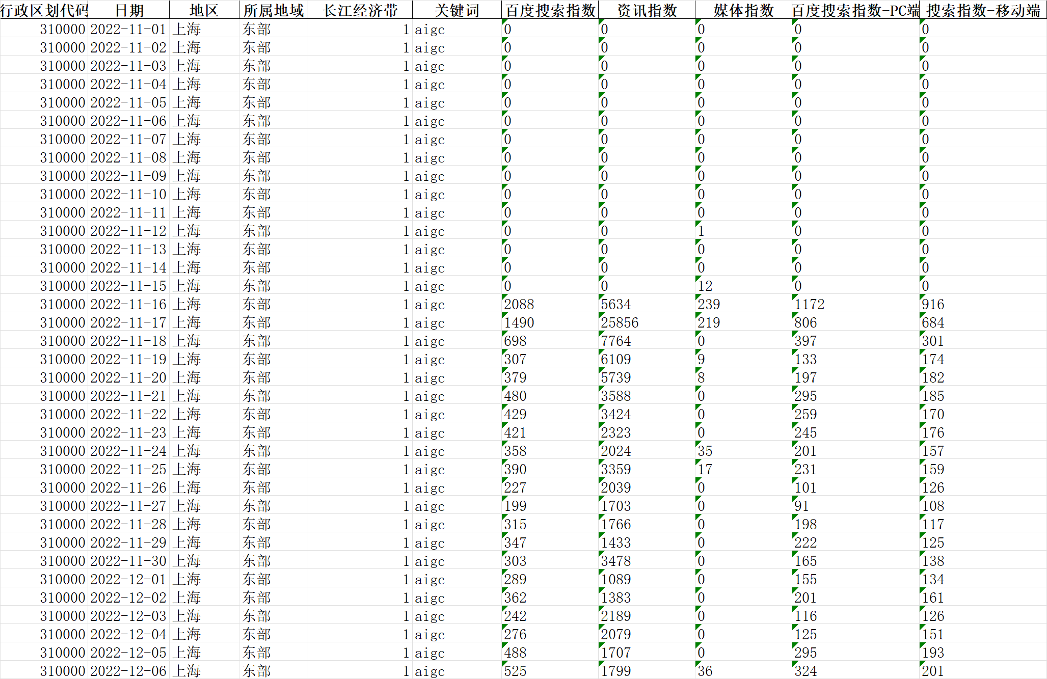 相关数据:行政区划代码、日期、地区、所属省份、所属地域、长江经济带、关键词、百度搜索指数、资讯指数、媒体指数、百度搜索指数-PC端、搜索指数-移动端、整理日期