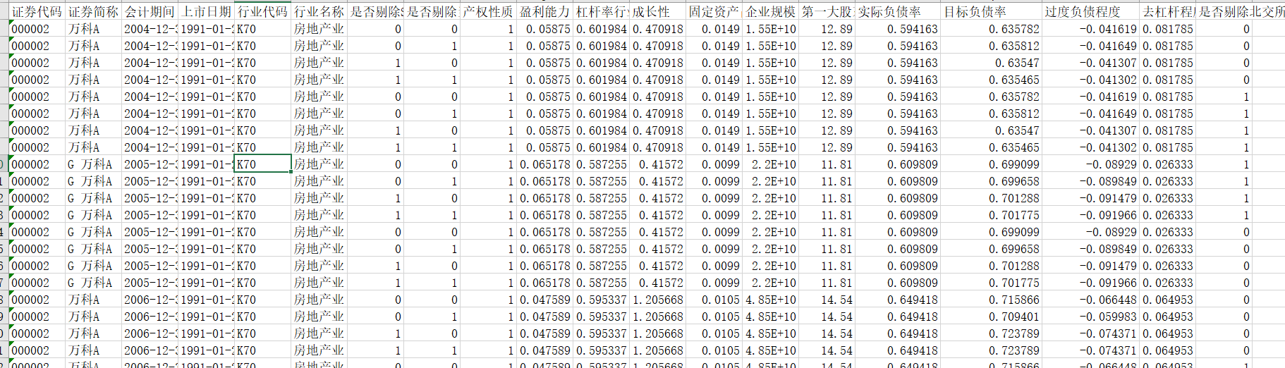 证券代码、证券简称、会计期间、上市日期、行业代码、行业名称、是否剔除ST或*ST股、是否剔除当年新上市、已经退市或被暂停退市的公司、产权性质、盈利能力、杠杆率行业中位数、成长性、固定资产占比、企业规模、第一大股东持股比例、实际负债率、目标负债率、过度负债程度、去杠杆程度、是否剔除北交所上市公司