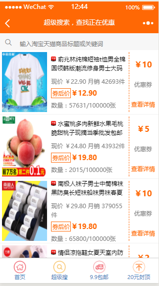 1、这是一个微信小程序对接淘宝的淘宝客api自助搜索优惠券领取程序,简单易学,有兴趣的欢迎下载