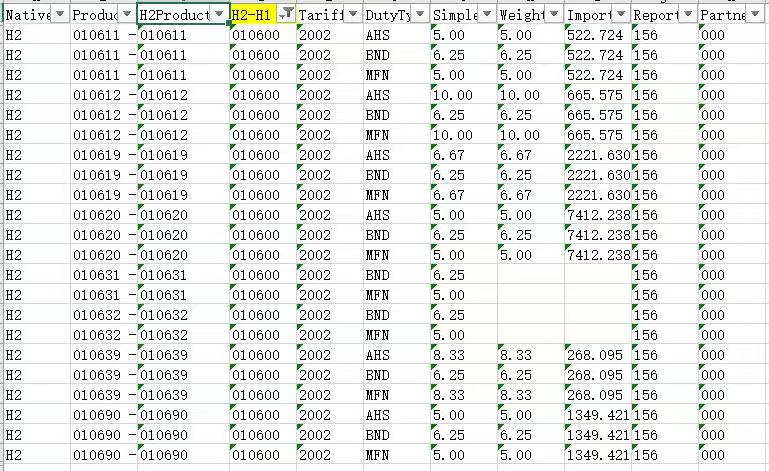 在将HS02转为HS96遇到了一个问题,我将HS2002统一到HS1996的时候发现有很多H02都可以转为同一个H96,比如H96的010600就可以对应很多个H2002的编码,我有一个问题就是我转换是转换过来了,但是我2002年就有很多个010600,也会有很多个对应的不同关税,我就没办法确定这个产品2002年的具体关税了,这种情况我该怎么办呀,是直接将所有与关税平均吗?求各位大神解答,第一个图是转换成功过后的数据,可以看到有很多个HS02转换成了010600,关税也对应了很多个,第二个图是HS02和HS96的转换对应表。