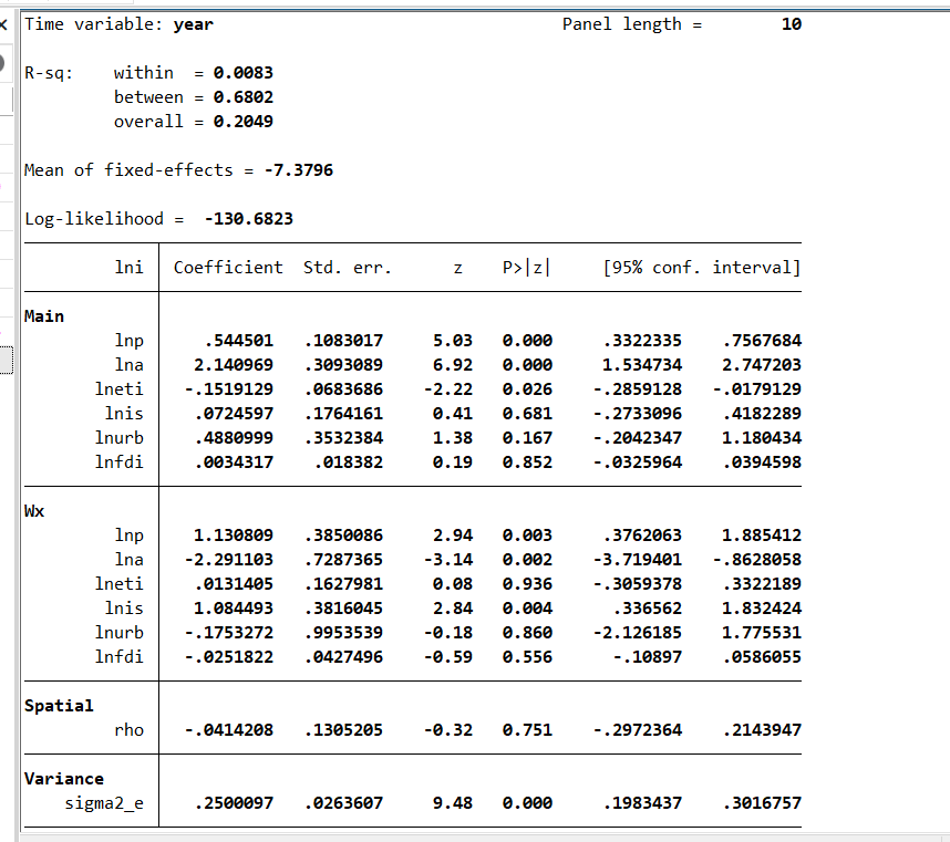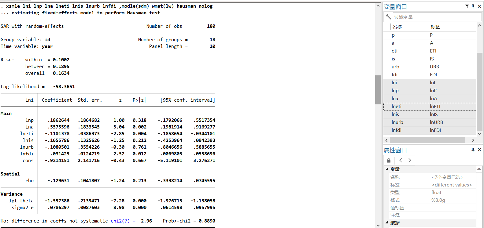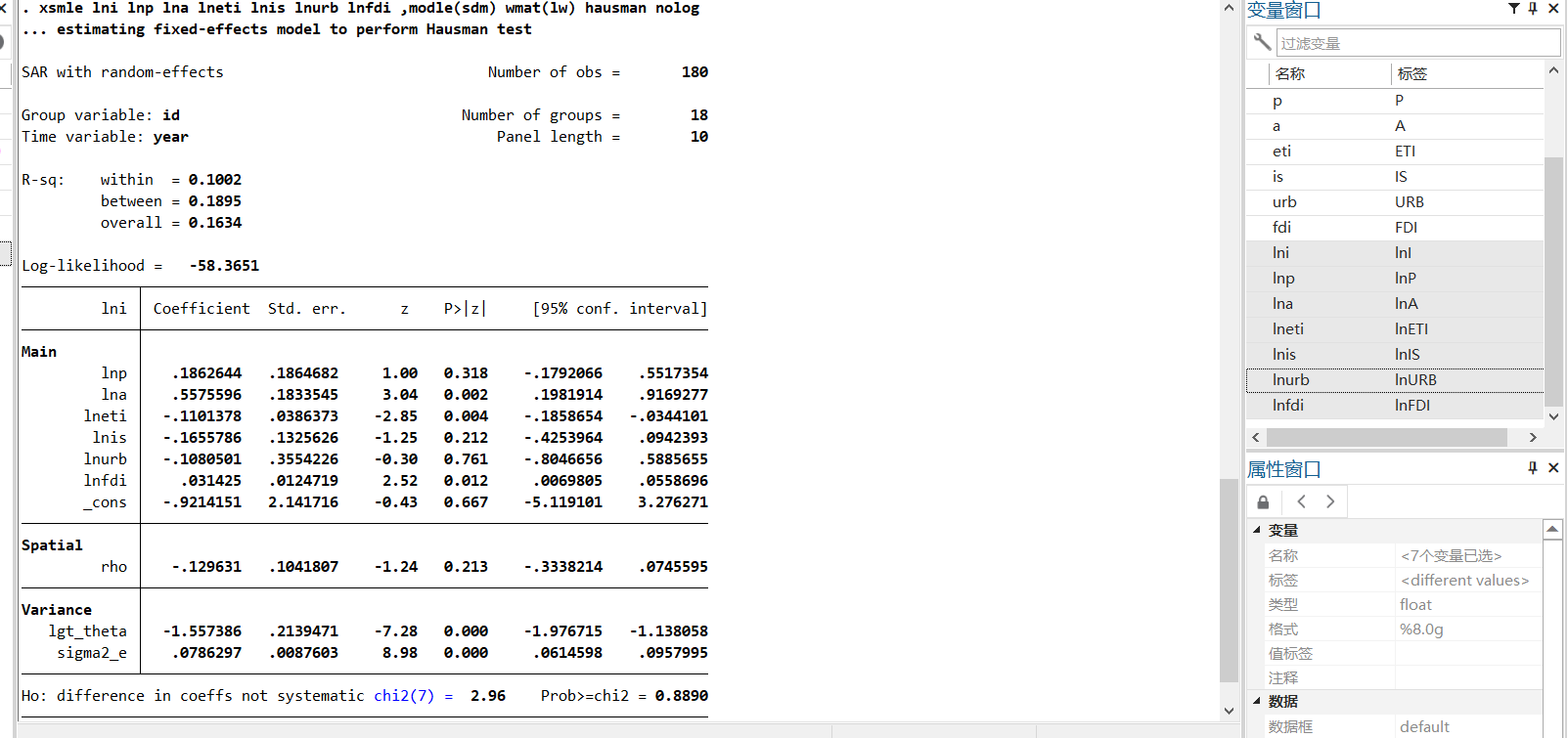 给数据做莫兰指数后,发现莫兰指数是显著相关的;其次我就进行豪斯曼检验,检验是否拒绝原假设,结果p值为0.889,是随机效应模型....