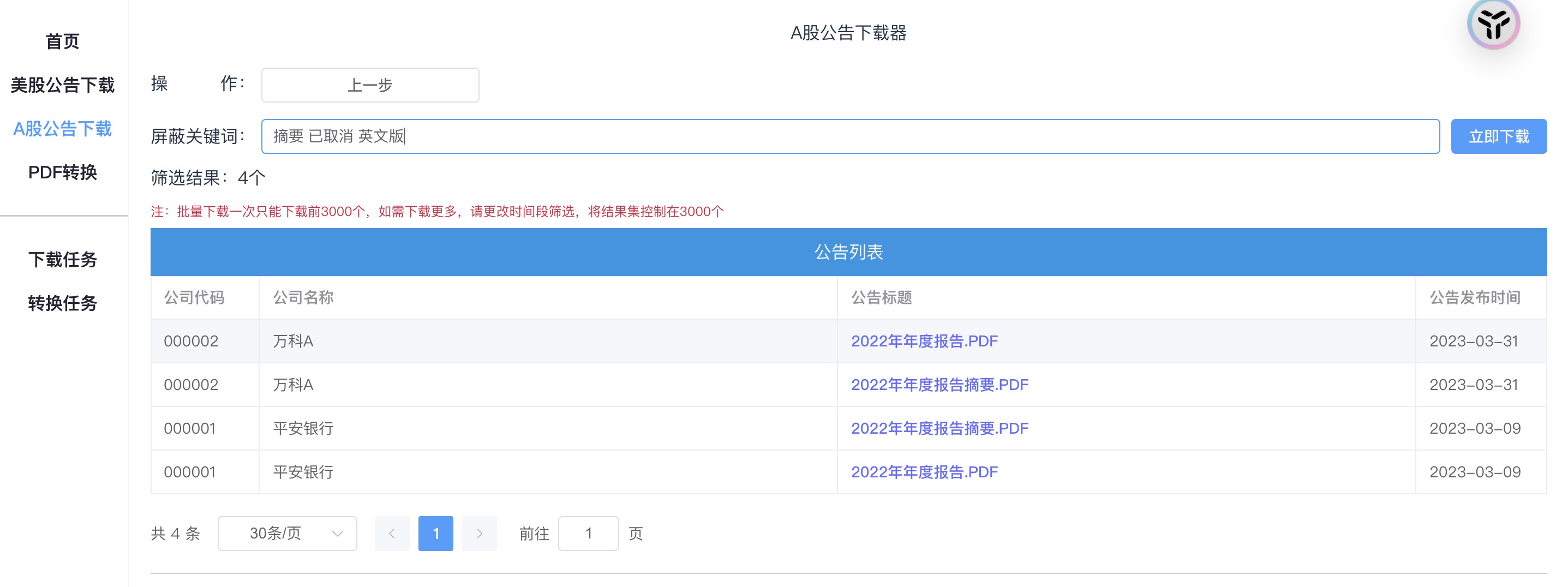 可以一键批量下载A股、美股公告、一键PDF转换的软件: