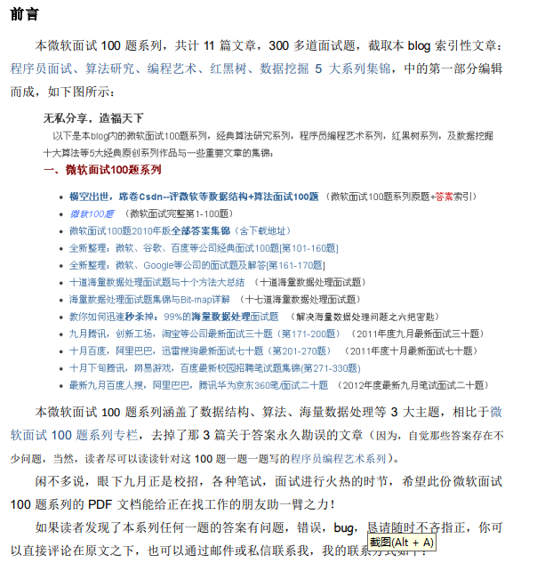 其中包含微软面试100题;名企笔试100题;十五个经典算法研究与总结、目录+索引;本人在笔试面试中遇到的疑惑等。