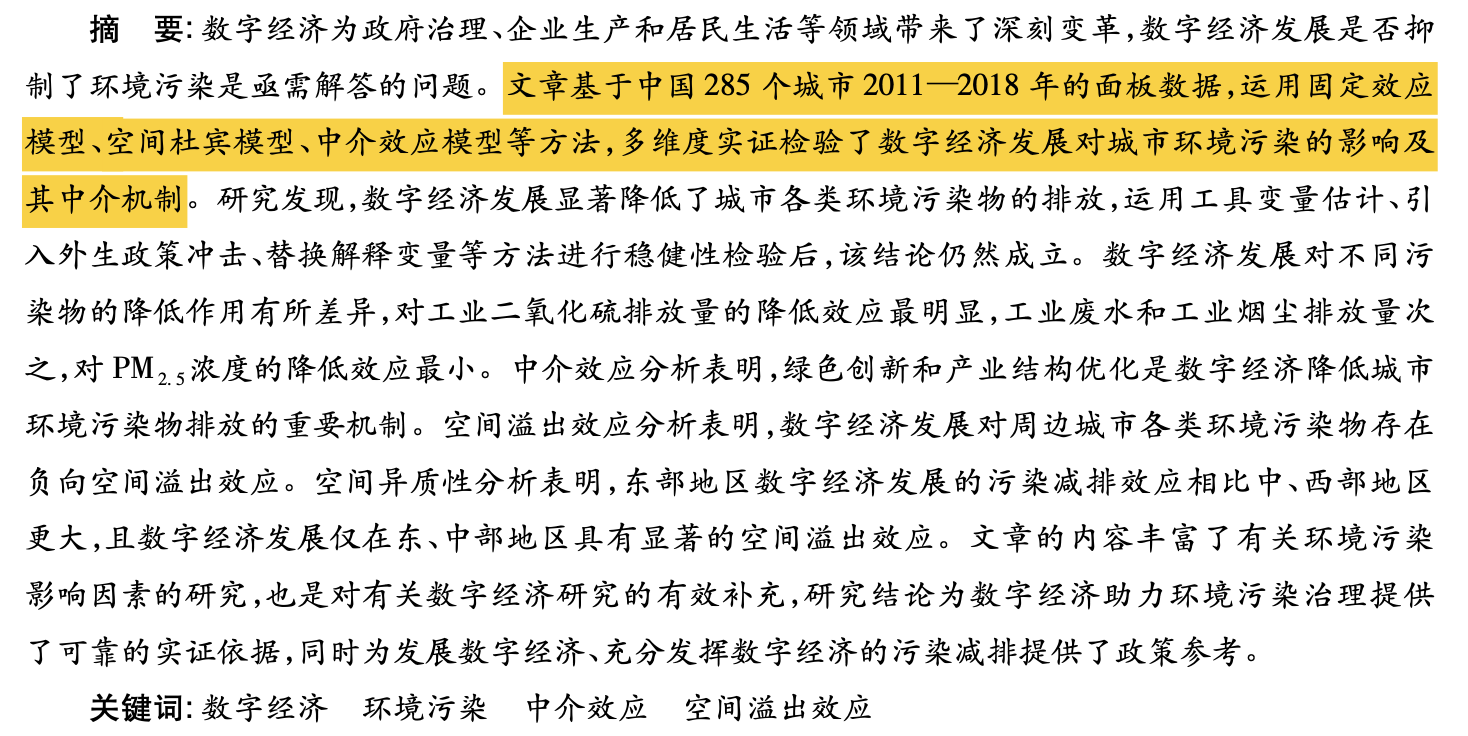 数据名称:全国301城市地级市数字经济发展对环境污染影响及中介机制(2011-2021年)