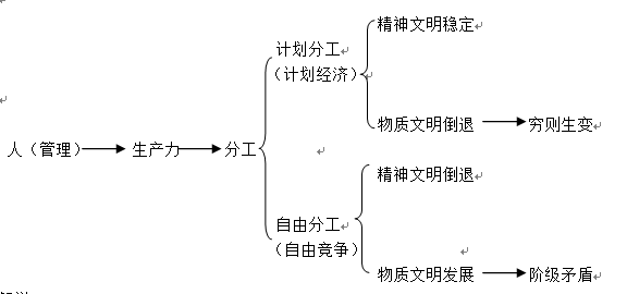 在人类管理的前提下,生产力实现大发展。发展必然迎来分工。分工有两个选择,即、计划分工和自由分工。计划分工,正是马恩格斯提出来的破局之法。可以迎来精神文明的稳定,但是物质文明必然倒退。治国理政按吃饱穿暖的原则来说,正是当前世界上绝对大多数国家选择自由竞争的原因。因为穷则生变的后果,那会让人更加防不甚防。自由分工,即自由竞争,必然迎来精神文明的倒退,物质文明的发展,必然滋生阶级矛盾。