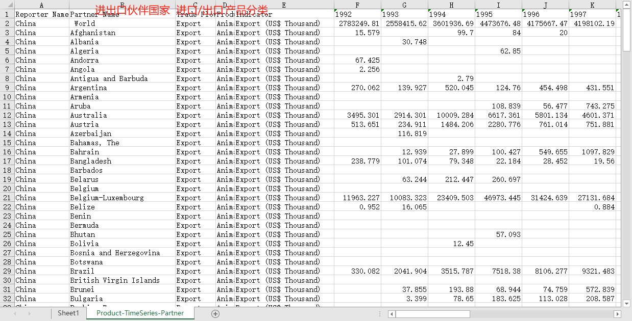 Reporter Name报告主体国家 Partner Name对应的伙伴国家 Trade Flow进口/出口 Product Group产品分类 Indicator 1992 1993 1994 1995 1996 1997 1998 1999 2000 2001 2002 2003 2004 2005 2006 2007 2008 2009 2010 2011 2012 2013 2014 2015 2016 2017 2018 2019 2020 2021
