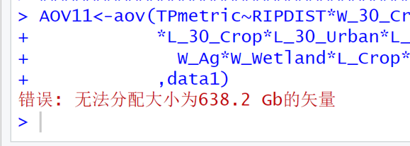 我现在有18列数据,其中一列是因变量(数值型),我想得到其余17列变量(类别变量)之间有无交互作用。我尝试了R语言aov函数,具体代码是aov(因变量~a1*a2*....*a17)