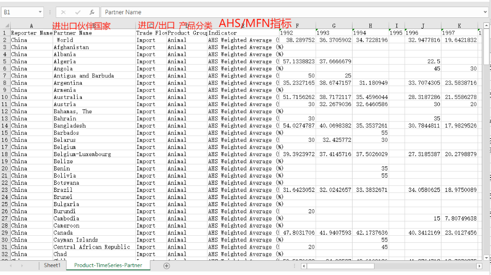 Reporter Name报告主体国家 Partner Name对应的伙伴国家 Trade Flow进口/出口 Product Group产品分类 Indicator 1992 1993 1994 1995 1996 1997 1998 1999 2000 2001 2002 2003 2004 2005 2006 2007 2008 2009 2010 2011 2012 2013 2014 2015 2016 2017 2018 2019 2020 2021