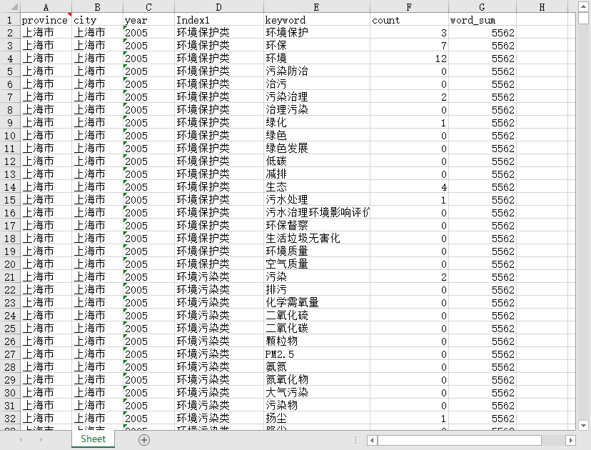 随着经济的高速发展,我们逐渐从注重经济增长转向发展可持续生态理念,为了响应绿色发展、可持续发展理念,我国在第75届联合国大会上提出了实现碳达峰和碳中和的目标。所以,为了达成碳达峰、碳中和目标,政府部门和企业都需要做出相应改变,随着碳市场的建立和完善,政策与绿色环保概念越来越相关,各地级市绿色环保词的出现频率,如污染防治、治污、绿化、绿色发展、低碳、减排、生态、污水处理等可以体现各地区对绿色发展的关注度。对绿色环保词频率的研究对探究当地经济发展方向具有重要意义,例如以绿色词汇数来衡量当地政府和企业所制定/面临的环境规制和环境监管等。这方面的研究已经发表在《财经研究》、《经济研究》等高质量期刊上。