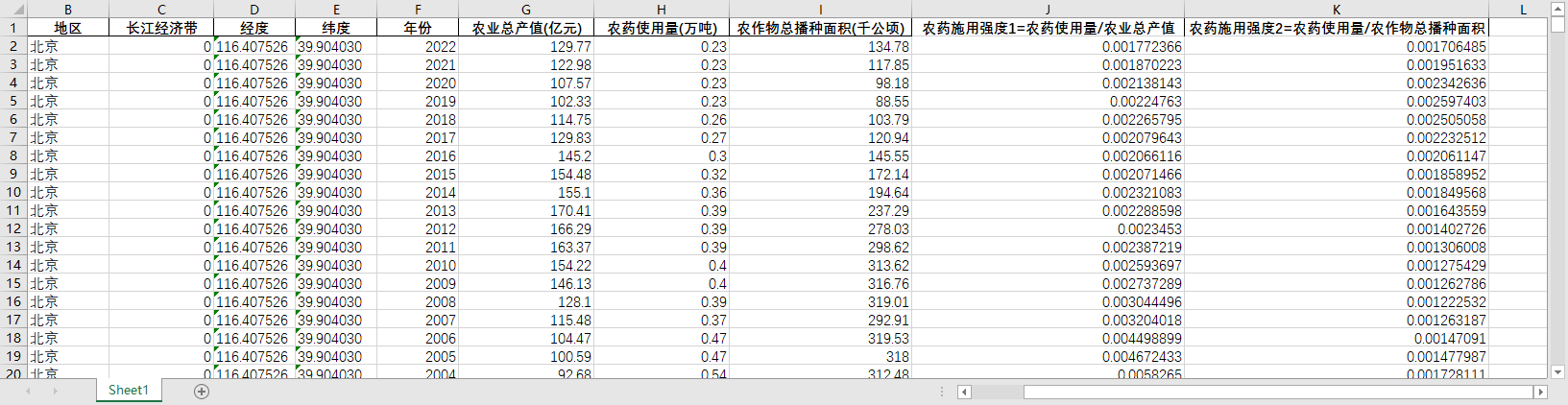 行政区划代码 地区 长江经济带 经度 纬度 年份 农业总产值(亿元) 农药使用量(万吨) 农作物总播种面积(千公顷) 农药施用强度1=农药使用量/农业总产值 农药施用强度2=农药使用量/农作物总播种面积