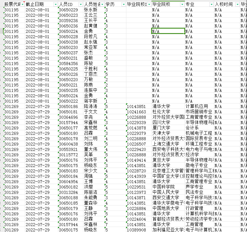 股票代码、截止日期、人员ID、人员姓名、学历、毕业院校ID、毕业院校 专业、入校时间、毕业时间