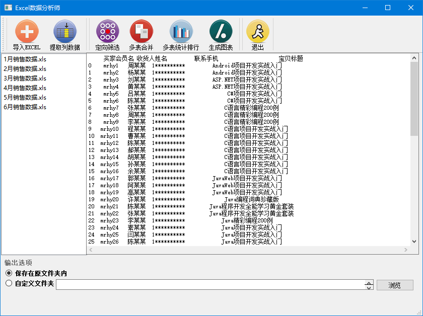 (2)提取列数据。单击工具栏中的“提取列数据”按钮,提取买家会员名、收货人姓名、联系手机和宝贝标题,效果如图3所示。提取后的数据将保存在程序所在目录下的mycell.xls文件中。