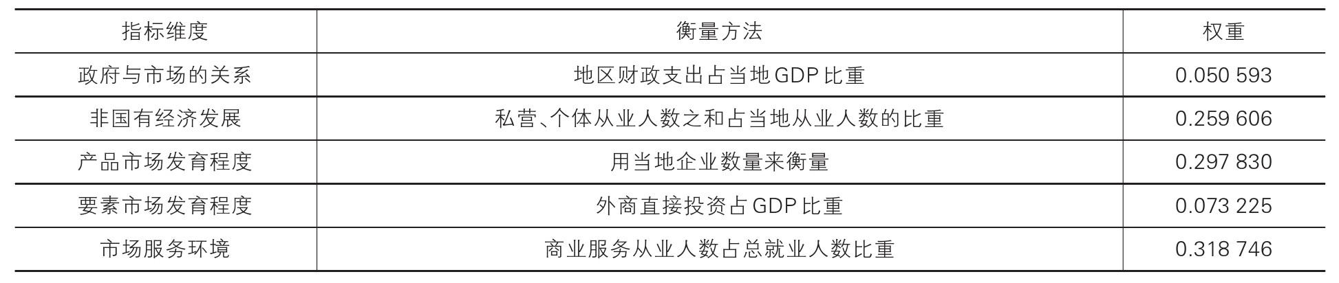 计算参考张治栋和张凯(2023)的做法,分别从市场与ZF的关系、非国有经济发展、产品市场发育程度、要素市场发育程度、市场服务环境五个方面选取指标并采用主成分分析法确定各指标的权重合成各地区的市场化指数。