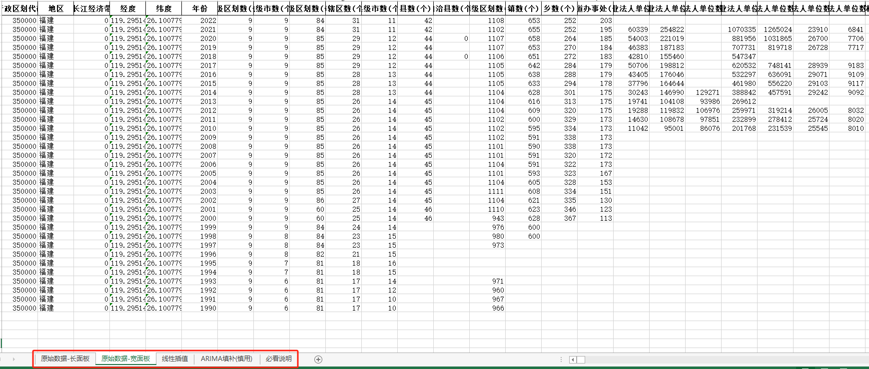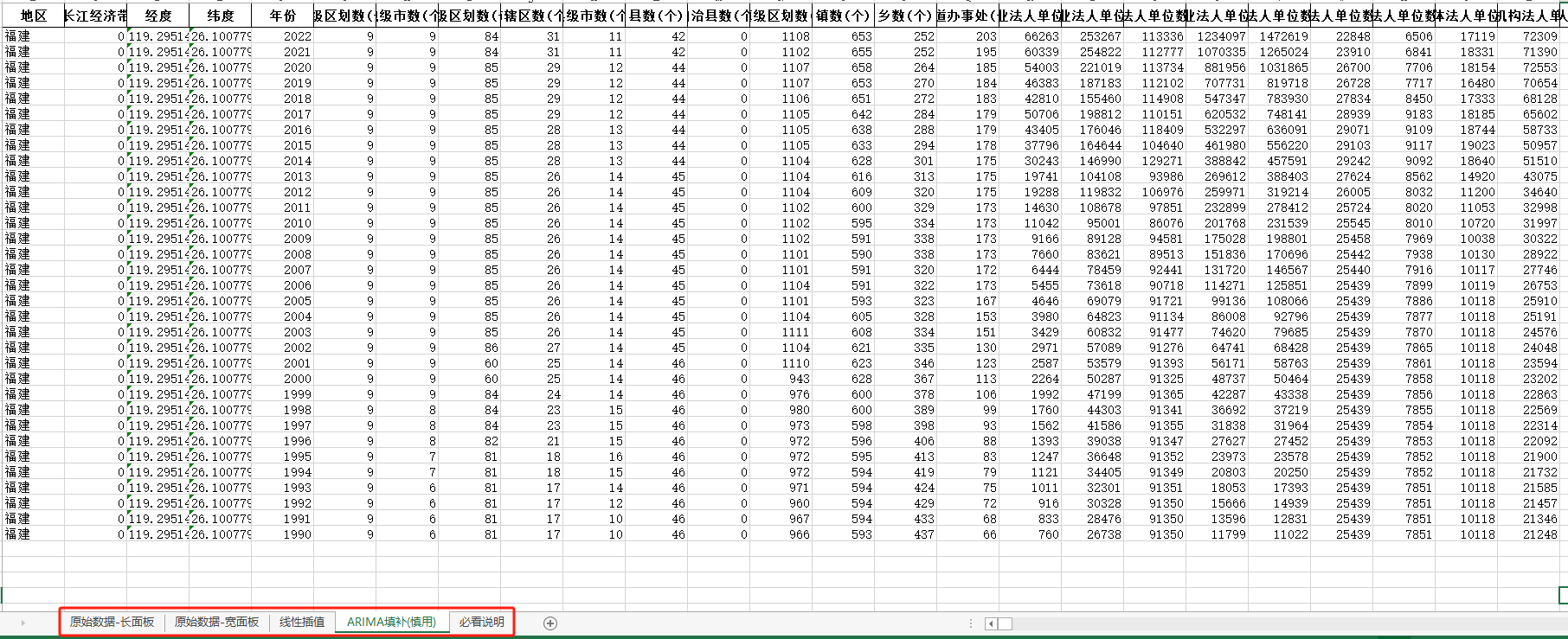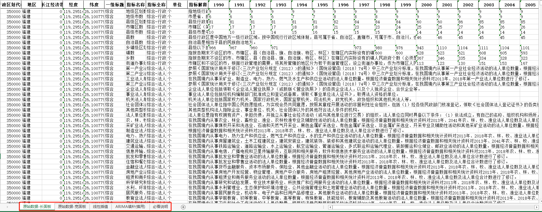 中国省级面板统计数据库(包含四个页签:原始数据-长面板、原始数据-宽面板、线性插值、ARIMA填补四个页签)